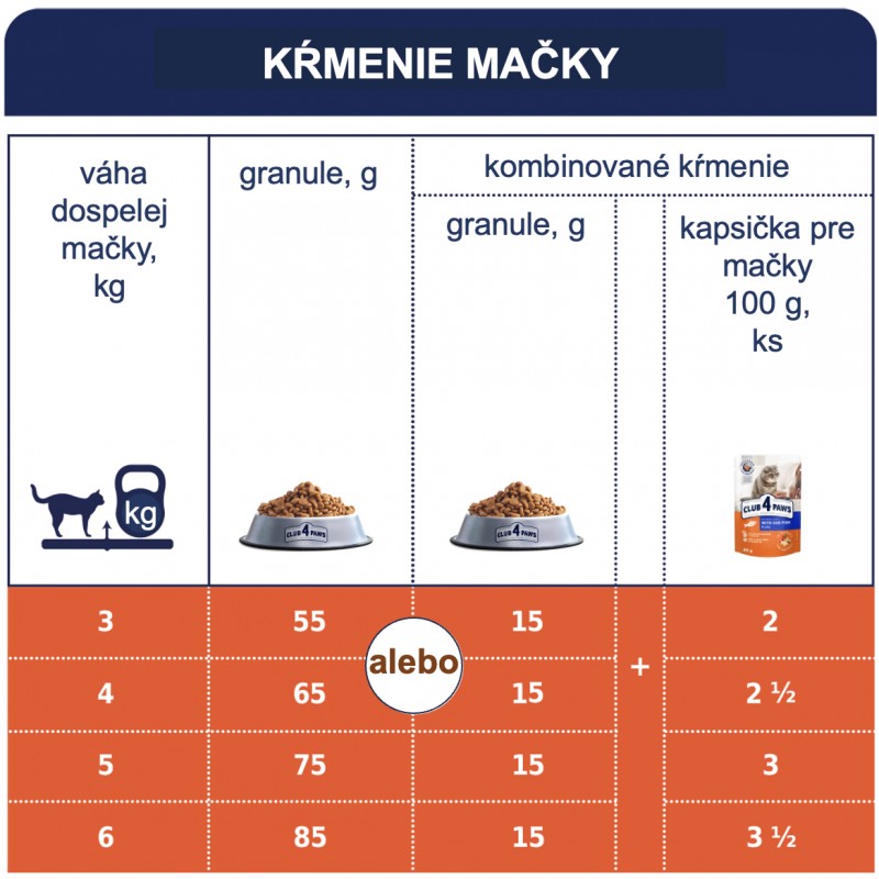 Skladujte na chladnom, suchom a nie slnečnom mieste. Krmivo pre domáce zvieratá sa musí do jedla zavádzať postupne (najmenej počas prvých 5 dní). Poskytnite svojmu domácemu miláčikovi bezplatný prístup k čerstvej a čistej vode. Požiadavky jednotlivých mačiek sa môžu líšiť v závislosti od veku, plemena, prostredia a úrovne aktivity. Pre dospelé mačky používajte zmiešané krmivo s konzervami pre zvieratá CLUB 4 PAWS v konzervách. Výrobné číslo a číslo minimálnej trvanlivosti sú uvedené na obale.