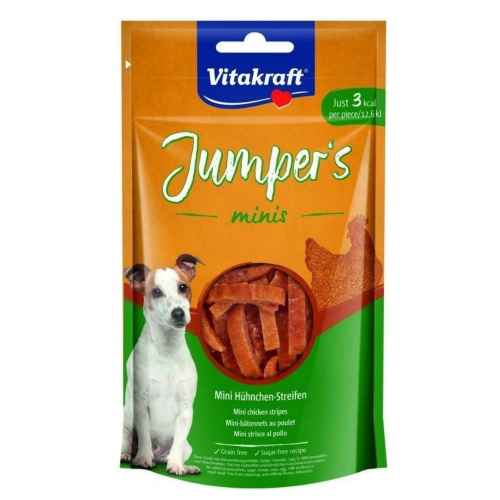 Vitakraft Jumpers Minis sú malé, chutné kuracie pásiky, ideálne ako odmena alebo pochúťka pre psov všetkých plemien. Vďaka praktickej veľkosti mini kúskov sú ideálne na rýchle odmeňovanie počas tréningu alebo hry.
